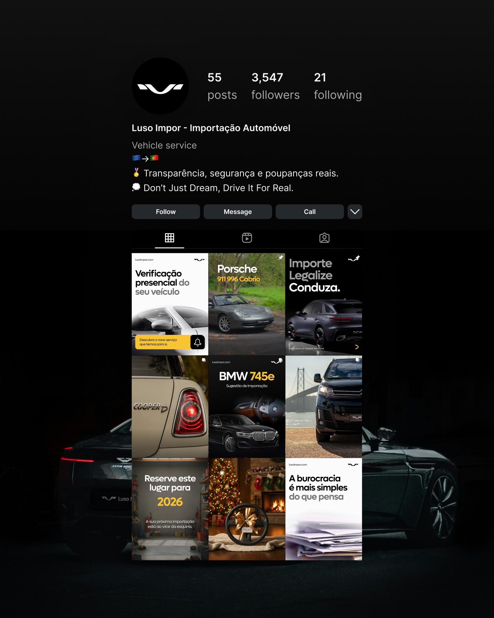 Luso Impor came to us with nothing but expertise. No brand. No website. No social presence. They were starting from absolute zero in a highly competitive automotive import market dominated by established players with decades of trust and deep pockets. They needed everything: a brand that could command respect, a web presence that could actually convert, and a social strategy that could build credibility from day one.